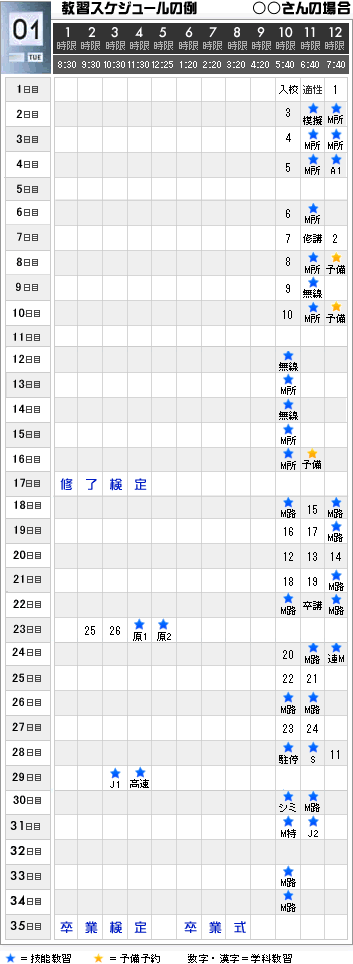 最短で取得を目指すためには、平日の放課後、夜間は、ほぼ毎日の教習となりますので、一定期間は教習を優先していただかなくてはなりません。平日夕方以降と土曜日を中心とした下記のような教習スケジュールを予約時におつくりいたします。