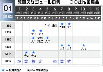 | スケジュール教習で、計画的、効率的に目標6日間で卒業を目指すコースです。 |